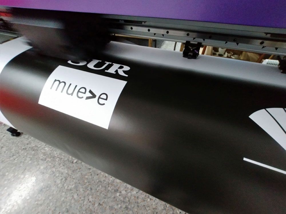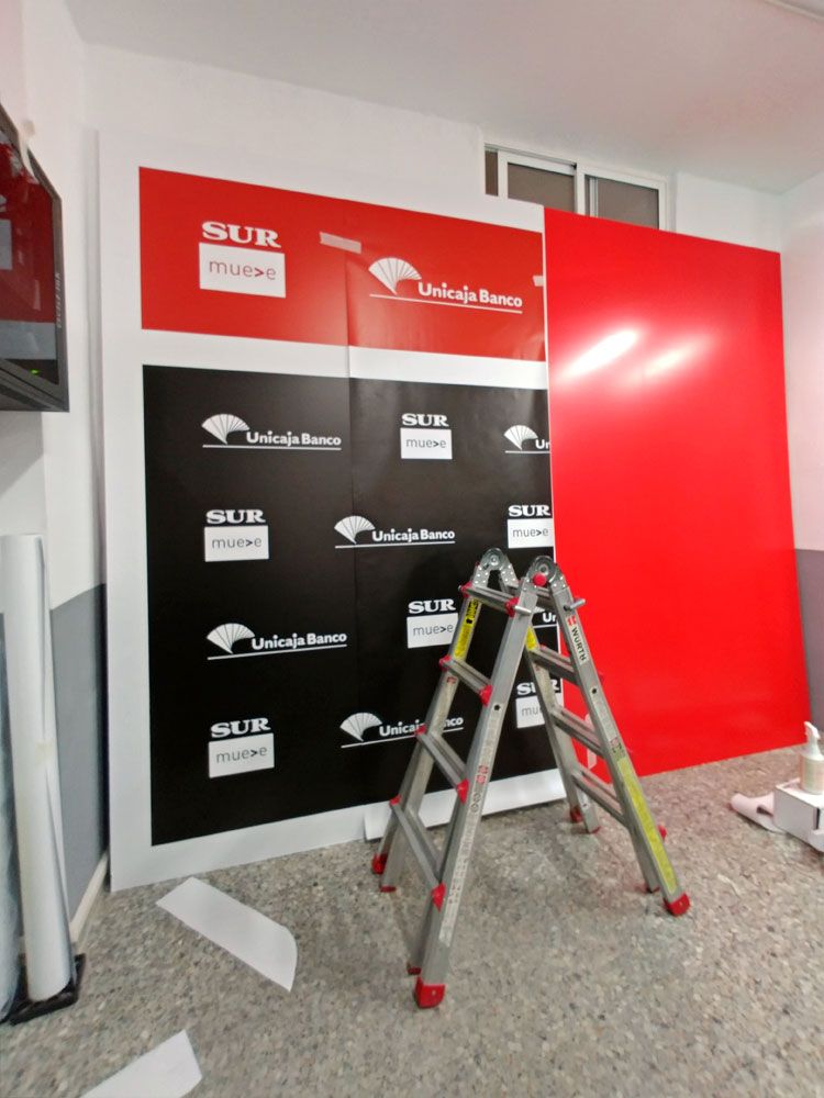 Impresión e instalación del photocall de 6 x 3 metros, tótem para escenario del catering con acabado en vinilo negro mate y corpóreas con logotipo, atril escenario principal.